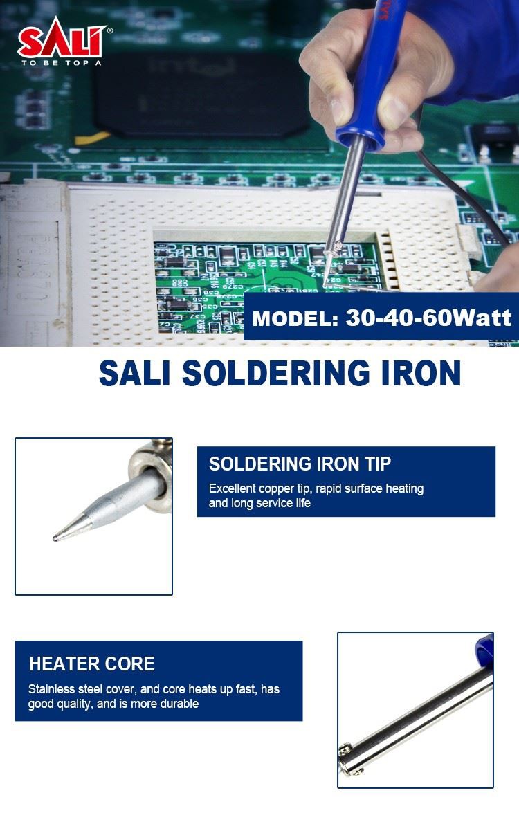 Seterika elektrik pemanasan dalaman Kepala seterika seterika elektrik pemanasan dalaman dimasukkan ke dalam teras besi, dan ia boleh digunakan apabila ditenagakan selama 2 ~ 5 minit mengikut kuasa yang berbeza. Suhu tertinggi kepala besi boleh mencapai kira-kira 350 ℃. Seterika pematerian haba dalaman biasa ialah 30W, 40W, 60W dan sebagainya. Pembaikan peralatan elektronik dengan besi pematerian elektrik haba dalaman 30W adalah ok